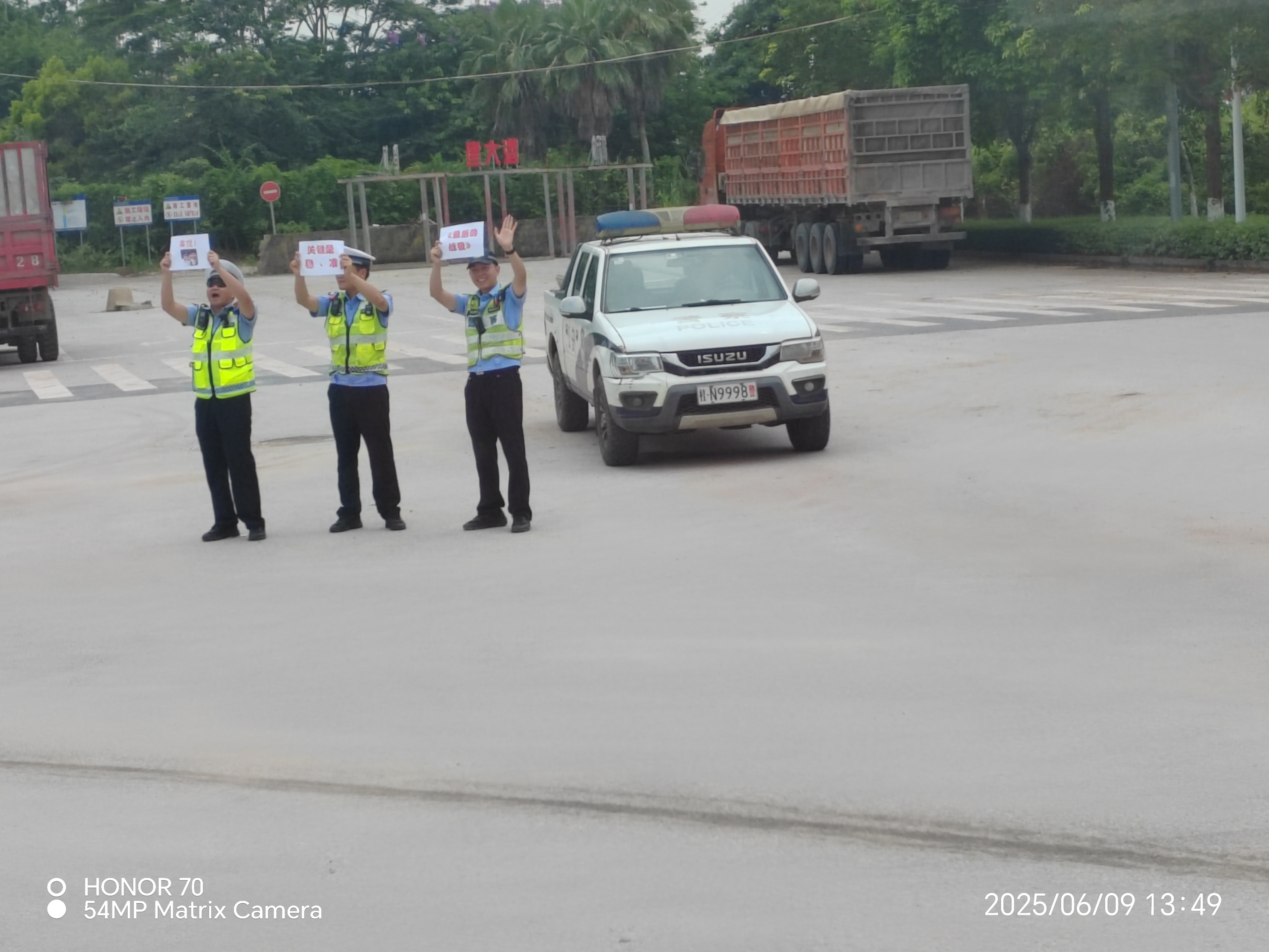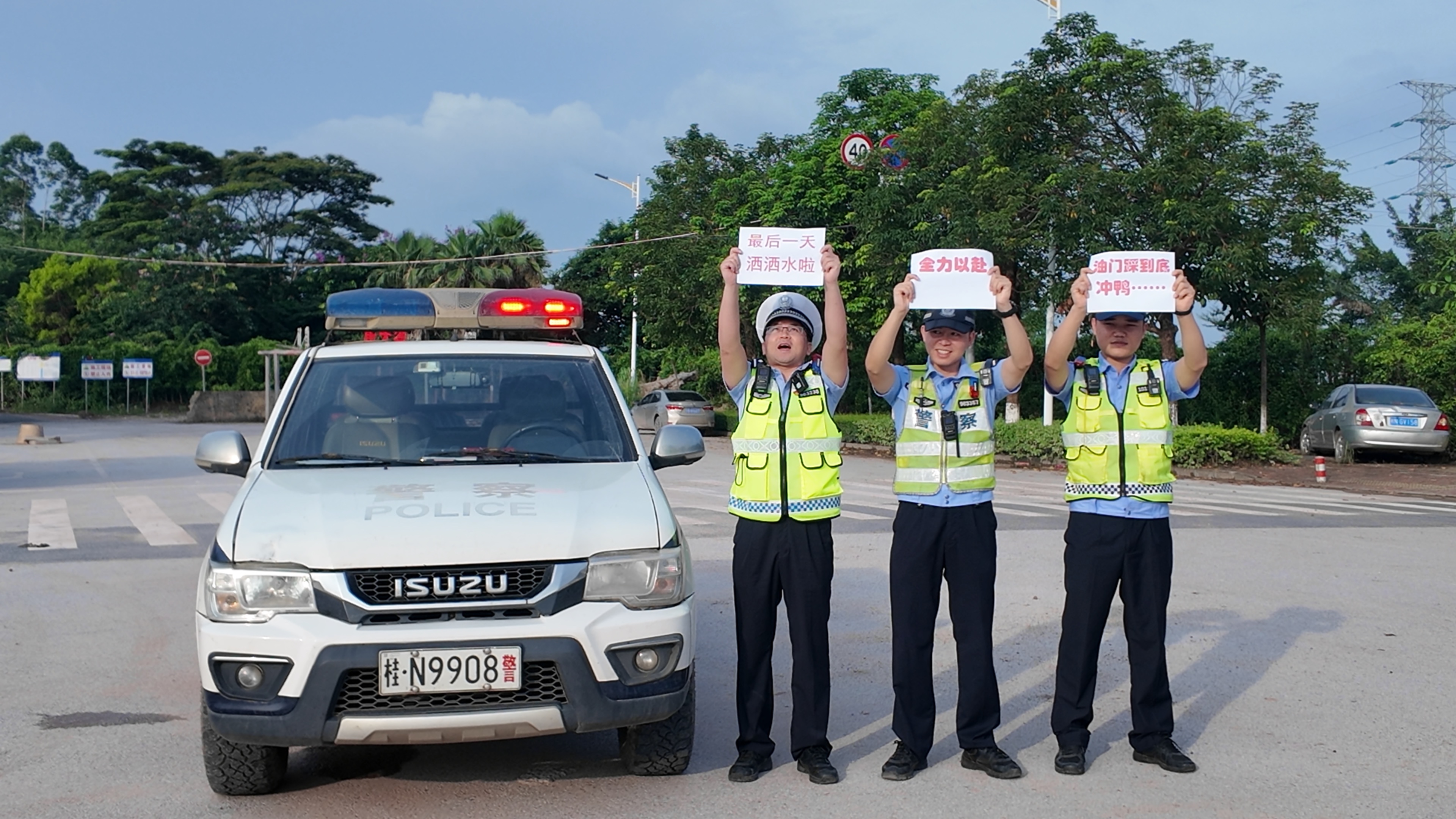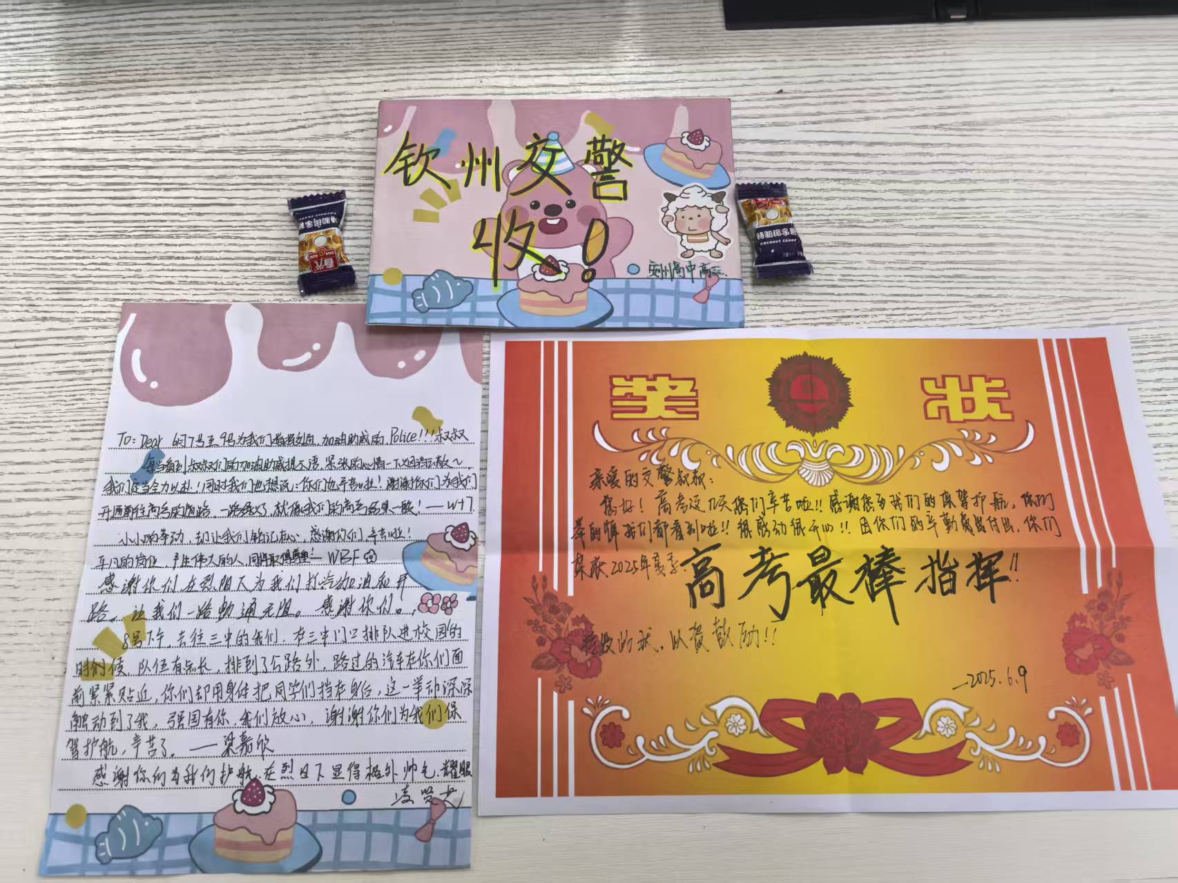 在这高考的三天里,钦州市公安局交警支队二大队黄国欢等民警为我们学校保驾护航,每次送考路上都能在路口看见他们高举不同的高考祝福,点燃我校高三学子的热情,高考结束后,我校高三22班同学们为他们送上感谢信和“奖状”,老师和高三同学们纷纷与他们合影留念,双向“奔赴”。